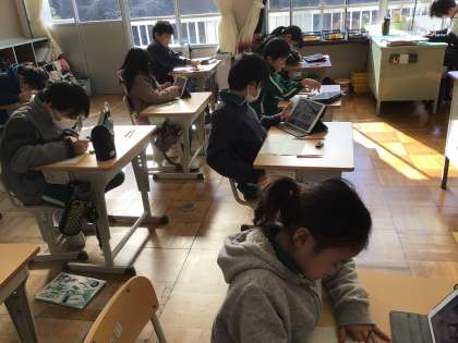 5.6年生は、文集「やまもも」に載せるカットをかきました。総合的な学習で学んだ「棒の手」に関わる写真などを見直しながらかきました。