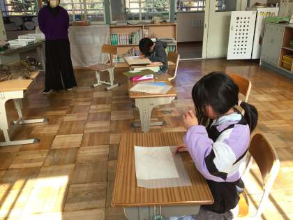 3.4年生は図工で版画の下絵をかきました。先日かいたデッサンを薄い紙に写し、さらに版画の板に写していきます。きれいに写そうと、慎重に取り組んでいました。