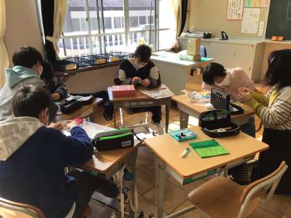 5.6年生は、家庭科で小物作りをしました。前回より刺繍やボタン付けなども進み、小物入れが完成しました。すぐに使えそうな作品ばかりでした。