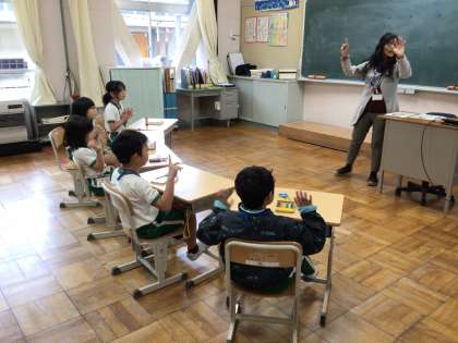 2年生は外国語活動で、アルファベットの読み方や、そのアルファベットがはじめにある単語の読み方を練習しました。体を動かしながら練習したので、少しずつ読む声も大きくなってきました。