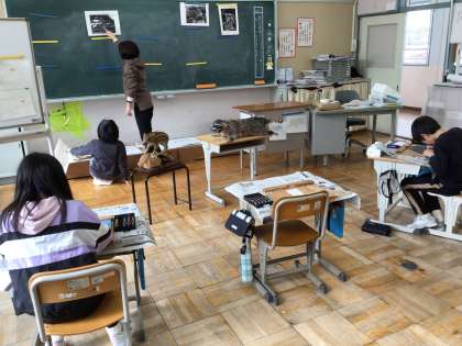3.4年生は図工の時間に版画を作っています。動物のデッサンを元につくりました。一度試し刷りをした後で、さらに彫り加えて、自分の納得のいく作品を作っていました。