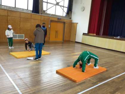 3.4年生は体育でマット運動をしました。ブリッジをしたまま歩いたり、前転の回り方を確認したりしていました。
