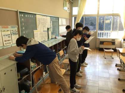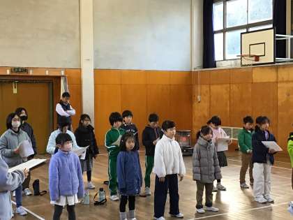 1年生から5年生は、6年生に一番伝えたいことは何かを考えながら練習しました。6年生は、5人でたくさんの言葉を伝えるので、それぞれ気をつけたいことなどのメモをとりながら練習しました。
