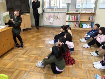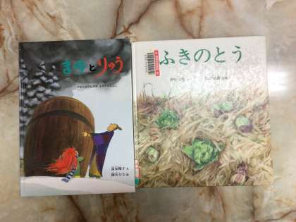 始めに「まゆとりゅう」というお話を読んでいただきました。「まゆとりゅう」の絵本の裏表紙にあった小さな植物をみんなで見ました。「ふきのとう」です。そこで「ふきのとう」のお話を読んでいただきました。本物のふきのとうを見たことがない子は、じっくりお話を聞いていました。