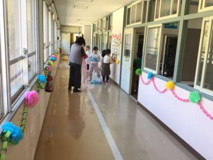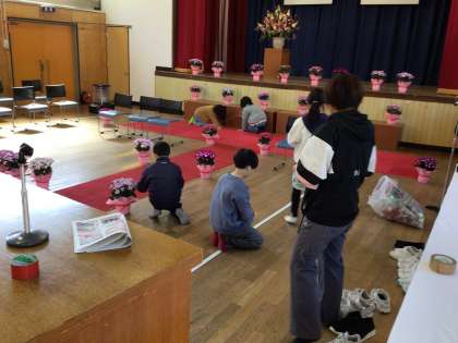 卒業式を前に、1年生から5年生までの子どもたちは、卒業式の会場を整えたり、教室、階段などを飾りつけたりしました。在校生の心のこもった式場ができました。