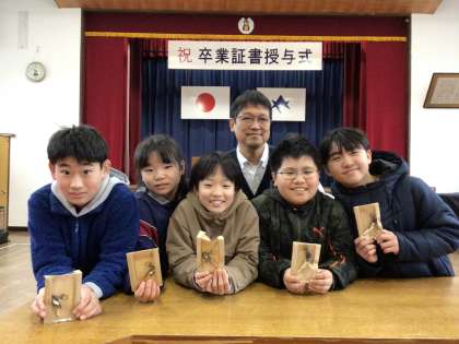 6年生には校長先生から、手作りのキーホルダーのプレゼントがありました。鹿の角で作ったもので、形も一つ一つ違います。一人一人が各々の好きな形を選んでいました。「自分の選んだキーホルダーとの出会いが一人一人違うように、これから先の出会いも人それぞれ。これからの出会いを大切にしてほしい」というお話もありました。