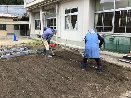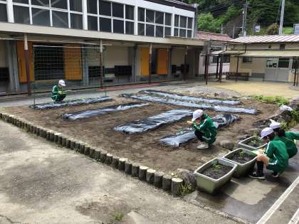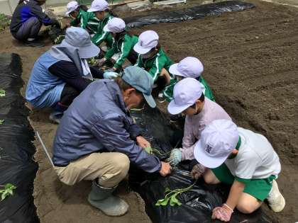 1.2年生の野菜づくりが始まりました 公開日 2025/05/12 更新日 2025/05/12 特色ある学校づくり推進事業 地域の松井さんご夫妻にお手伝いいただき、1.2年生が畑に野菜の苗を植えました。まず、1.2年生が来る前に、松井さんが畑に畝を作り、マルチシートをかけてくださいました。そのあとに、さつまいもやトマト、きゅうりなどの苗を植えました。松井さんからは、水のあげ方などのアドバイスもいただきました。 1年 2年 3年 4年 5年 6年 PTA 特色ある学校づくり