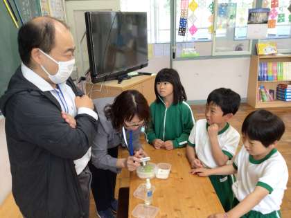 先日の音楽で「かたつむり」の歌を学習した時、事務職員の太田さんがかたつむりを飼っていることを知った1年生。太田さんの飼っているかたつむりを見せていただくお願いをしました。すると今日見せていただくことができました。そして、見せていただいたのは、なんと、かたつむりの卵と生まれたばかりの赤ちゃんかたつむりでした。1年近く飼っているそうで、かたつむりを飼っている時のエピソードなどたくさんのお話を聞きました。1年生だけでなく、先生方も興味深々でした。