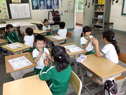 1.2年生は音楽でカスタネットの練習をしました。怪獣の手でたたくことをペアの友だちと確認しました。また、曲に合わせて元気よく歌いながら演奏もできました。