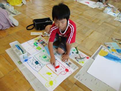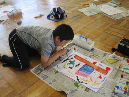 こちらは、3・4年生の図工の様子です。ストローや歯ブラシを使った技法を取り入れて「まぼろしの花」を描いています。