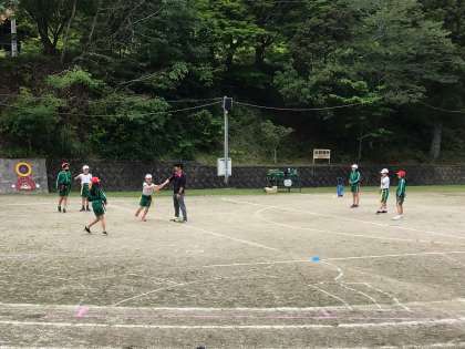 5.6年生は、体育の学習でフラグフットボールをおこなっています。ボールが相手に見えないようにパスをもらう練習をしました。