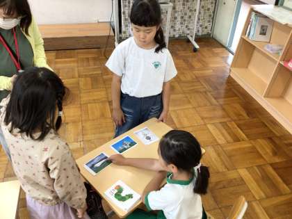 2年生は図工の時間に、アート作品の鑑賞カードから好きな作品を見つけました。立体的な作品、かわいらしい絵、立派な建築物などいろいろなカードから選び、選んだ理由を友達に話しました。