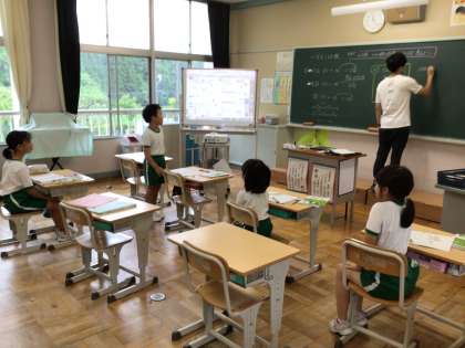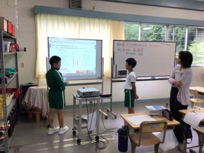 3年生、4年生はそれぞれわかれて算数の学習をしています。3年生は、数を10倍、100倍するとどんな数になるのかを、4年生は、平行四辺形と台形の違いを友だちに説明しました。