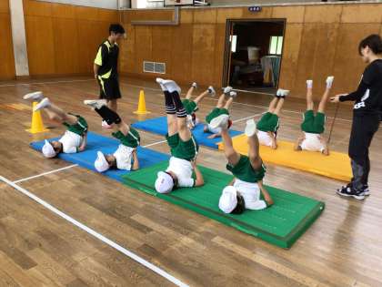 1.2年生は、マット運動をしました。腰のどの辺りに手を添えるか考えるうちに、足が高く上がるようになりました。