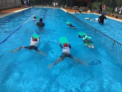 今年の水泳学習は、今日で最後でした。1.2年生は、ビート板を使って浅いプールを泳ぎきっていました。3.4年生は、平泳ぎに挑戦しました。足が難しかったようですが、がんばりました。5.6年生は最後に水遊びを楽しみました。浮輪とたらいに乗ってじゃんけんしたり、水中綱引きや水中バスケットをしたりしました。5.6年生の中には、25メートルを初めて泳ぎ切る子もいたようで、わずかな期間でしたが、どの子にとっても満足感いっぱいの学習になりました。
