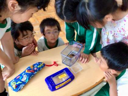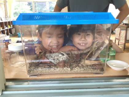 1年生は学校周辺の川で見つけたサワガニのお世話をしています。その中の1匹が脱皮しているのを見て驚いていました。他の学年の子もたくさん見にきていました。