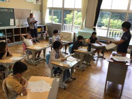 3.4年生は、夏休み中に頑張った宿題の提出をしていました。おうちの人と一緒に考えた一行詩の宿題は、自信まんまんで出していました。