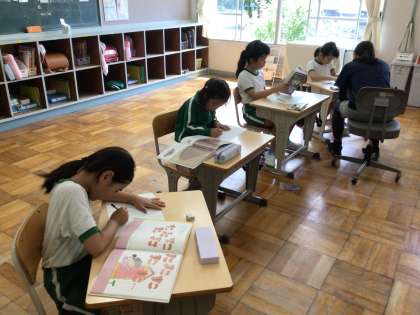 5.6年生は、一行詩はあっという間にかいてしまい、句に添える絵を一生懸命かいていました。一番伝えたい場面を思い出したり、本の挿絵をじっくり見てかいたりしました。
