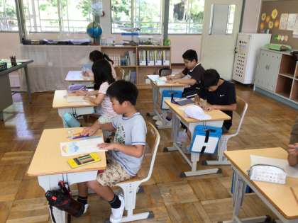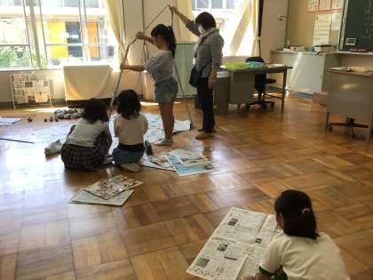 2年生は図工の時間に「新聞紙となかよし」の学習をしました。新聞紙を切ったり、ちぎったり、丸めたりしてみんなでアイデアを出し合ってものづくりをします。夏休みの思い出もあるのか、2年生の作品テーマはキャンプ。火を焚く場所を作ったり、テントを作ったりしていました。