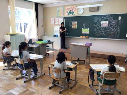 2年生は、国語の時間に「ニャーゴ」というお話を読んで学習しています。ねずみとねこの気持ちの違いをみんなで話し合っています。黒板が埋まるほどたくさんの意見を4人で出し合って考えました。