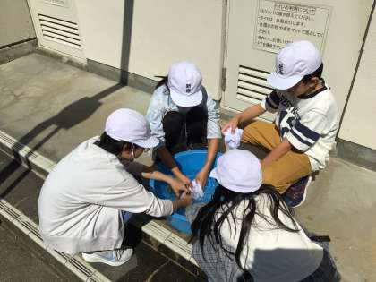 5.6年生は、家庭科の学習で「夏を涼しくさわやかに」の学習をしています。衣類の着方や手入れの仕方を学ぶ一つとして、洗濯の実習をしました。手洗いの様々な洗い方で、靴下の汚れを落としました。「ちょっときれいになったような気がする」という声が聞こえてきました。天気もよかったので、気持ちよく洗濯ができました。