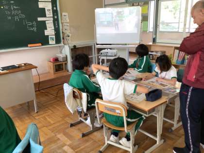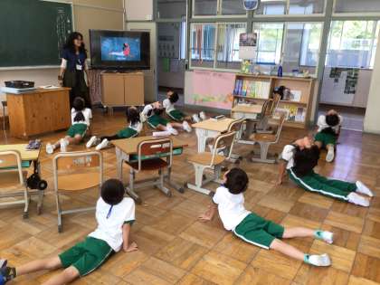 1.2年生は、動きの言葉を学ぶ動画を見ながら、体を動かしたり歌ったりしながら言葉を覚えていました。とても楽しんで学習していました。