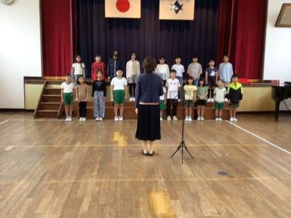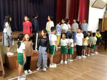 全校音楽 公開日 2025/10/15 更新日 2025/10/15 各学年から 学芸会に向けて全校で歌の練習をしました。「ビリーブ」を歌いました。高い声の出し方を講師の先生に教えていただきました。目を大きく開け、口を縦に開けると高い音が出しやすいことを知り、すぐにやってみた子がたくさんいました。最後の歌声は、高い音もとてもきれいに出すことができました。 3.4年生の児童が、3時間目に音楽の学習をしました。全校音楽で学んだことを授業の中で生かし、練習していました。