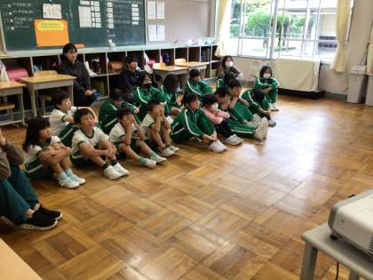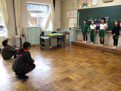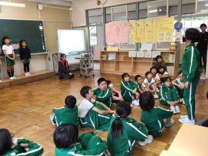 音読発表会ー2年生ー 公開日 2025/10/21 更新日 2025/10/21 各学年から 2年生が国語で学習した「ニャーゴ」の音読発表会をしました。全校の児童が集まり、録音された2年生の音読を目を閉じて聴きました。「声を聞いているだけで、怖そうに話している様子がわかった」「ねずみとネコのセリフの言い方の違いから、両方の気持ちの違いが伝わった」といった感想を上級生が発表していました。