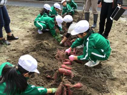 1.2年生は生活科の学習で春から育ててきたさつまいもの収穫をしました。とても大きなさつまいもばかりで、いもを手に取り、大歓声があがりました。