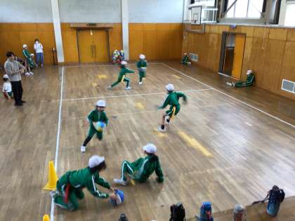 1.2年生は、体育の時間にボール遊び運動をしています。今日は、ドリブルをして走ったり、後ろ向きでドリブルをしたりしました。前回よりも速くドリブルができるようになりました。