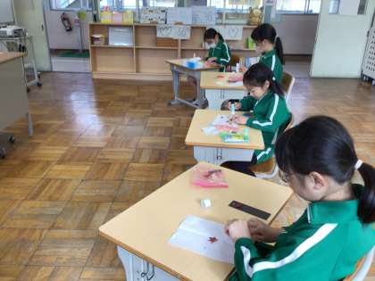 2年生は生活科の学習で秋の落ち葉を使って、栞を作りました。これは、100冊以上の本を読んだ自分へのプレゼントです。それだけにとどまらず、もう一つ栞を作り1年生にプレゼントしました。