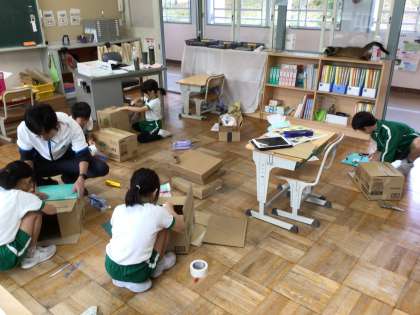 3.4年生は図工の時間に「おもしろだんボールボックス」の学習を始めました。自分が入れたいものが書いてある設計図を元に、大きな段ボールを切ったり貼ったりつなげたりして作っています。出来上がりが楽しみです。