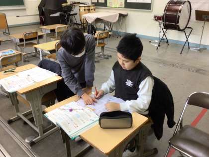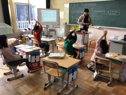 3年生、4年生はそれぞれで算数の学習をしています。3年生は、人と人の間の数に目をつけて長さを考える学習をしていました。全員で答えを予想しながら話し合っていました。4年生は小数のかけ算の学習をしています。二人で答えを確認したり、説明したりしながら学習しました。