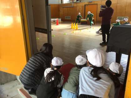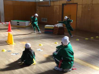 5.6年生が体育でパルクール鬼ごっこをしています。30秒以内に捕まえることを目標に頑張っていました。障害物をうまく利用して、たすきの尻尾を取られないように逃げていました。昨日、体育でしっぽとりをやっていた2年生も5.6年生の体育を見学していました。跳び箱から飛び降りて追いかけたり、棒の下をくぐって逃げたりする姿を見て「かっこいい」と話しながら見ていました。