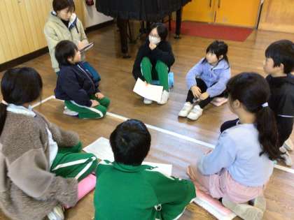 今日の対話集会では、出題者が想像している「もの」について、質問を繰り返しながら答えを探すトレーニングをしました。質問をする子は「はい」「いいえ」で答えられるような質問を考えたり、他の子の質問もしっかり聞いて答えを探したりしていました。出題者は、高学年の児童のアドバイスを聞きながら、問題や答え方を考えていました。みんなを答えに導くような質問を考えていた子もいました。全校で活動を振り返った時には、グループの中のどの子の質問で答えがわかるようになったのか伝えていた子もいました。