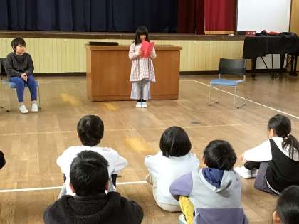 冬休み前集会では、マラソン大会の入賞者、一行詩集会の優秀作品賞やグループ賞の表彰がありました。その後、今年がんばったことを3名の児童が発表しました。「来年は、後輩に(リーダーの仕方など)がんばってきたことのやり方を伝えたい」といった抱負を語る児童もいました。