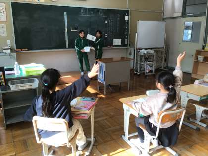 2年生は国語で「あなのやくわり」の学習をしています。2人が先生代わりになり、「はじめ」「なか」「おわり」がどこで変わるのかについて、意見を聞いていました。