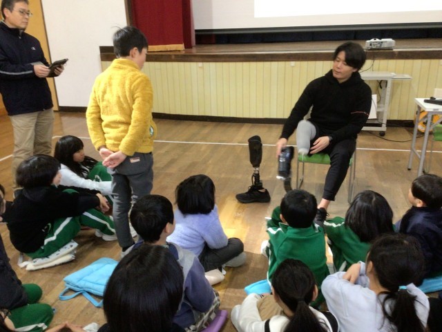 パラアスリートの方をお招きし、お話を聞きました。なぜ義足をつけて競技をすることになったか、その時の様々な思い、葛藤についてお話をしてくださいました。義足をつけたところを見たり、義足を実際に触ったりしました。始めは、義足をつけているとは思わなかった子どもたちでしたが、実際にその様子を見て驚いていました。しかし、お話をうかがう中で、アスリートの方の心の強さにも感動していました。