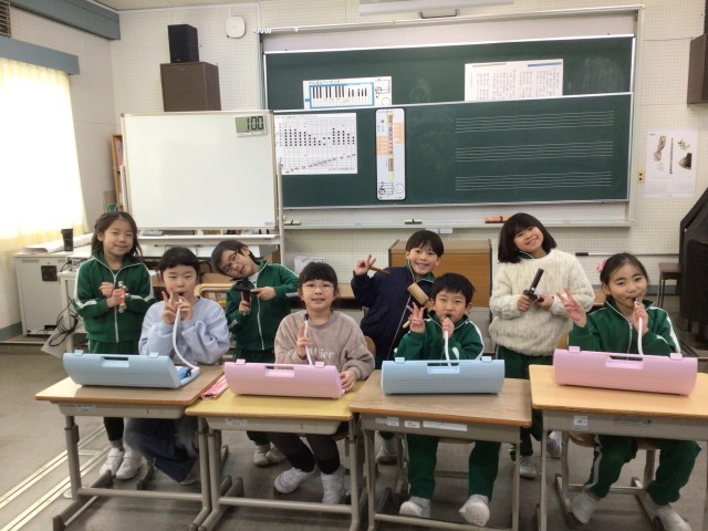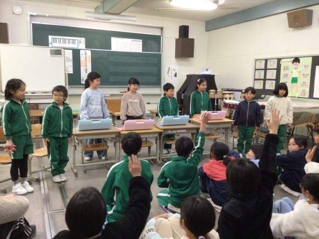 12年生 音楽発表 公開日 2026/01/29 更新日 2026/01/29 各学年から わくわくタイムに、1・2年生が、音楽の授業で練習した「山のポルカ」の器楽合奏を発表しました。集まった全校児童が、良かったところを一つずつ言いました。演奏した1・2年生も、聴いていた3~6年生も、全員が「音」を「楽」しめた時間でした。