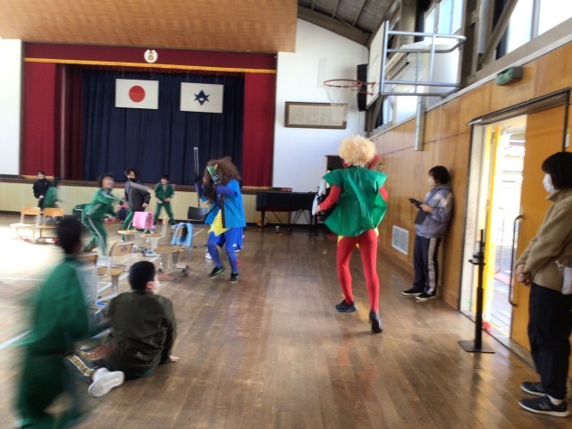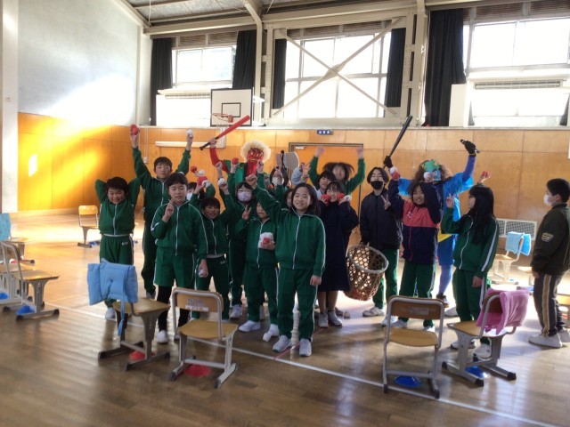 なかよし委員会による全校遊び 公開日 2026/02/03 更新日 2026/02/03 全校での活動 なかよし委員会が全校遊びを企画してくれました。わくわくタイムに「フルーツバスケット」をしていると…。今日は節分。突然、オニが乱入しました。みんなは玉入れの玉を使ってオニをやっつけました。最後は一緒に、「はい、チーズ!」みんなに福が来ますように…。