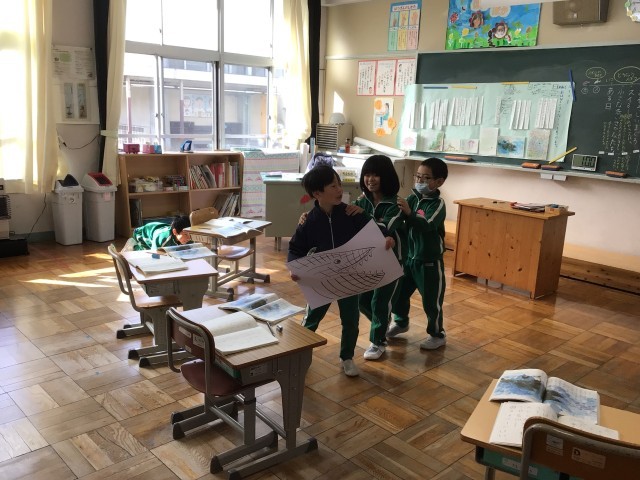 1年生は国語の学習で「スイミー」のお話を学習しています。自分たちの好きな場面を見つけ、その場面の様子やスイミーの気持ちを考えています。今日は、スイミーが大きな魚に襲われる場面について考えました。大きな魚に襲われたらどんなところに逃げるかをかんがえたり、ひとりぼっちになった気持ちを言葉にしたりしていました。最後には、その場面を劇にして表現しました。5年生は算数で「角柱と円柱」の学習をしています。今日は円柱の展開図を書いて切り取り組み立てました。組み立てる時に側面の展開図の横の長さを間違えて書いてしまったり、側面を重ねて貼ってしまったりしたことで、底面の円が側面と合わないこともありました。底面の円周と側面の展開図の横の長さが一緒であることが体感できました。