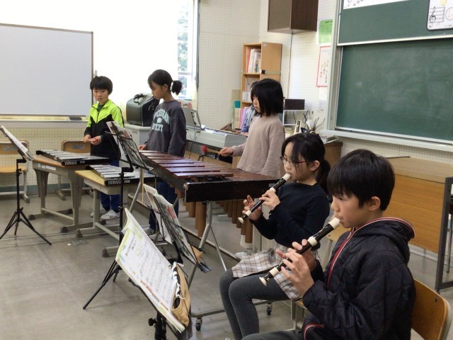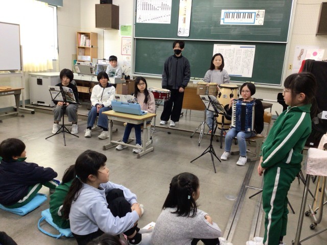 しんもり音楽会 公開日 2026/03/09 更新日 2026/03/09 全校での活動 3時間目に、音楽の授業で練習してきた器楽合奏を聴き合う「しんもり音楽会」を行いました。1.2年生は「こぐまの2月」、3.4年生は「パフ」、5.6年生は「キリマンジャロ」を発表し、感想交流を行いました。演奏する側も聴く側も、「音」を「楽」しむことができました。初めて見る楽器もありました。次の学年の音楽の授業でも、合奏や合唱を楽しみたいという気持ちがわいてきました。