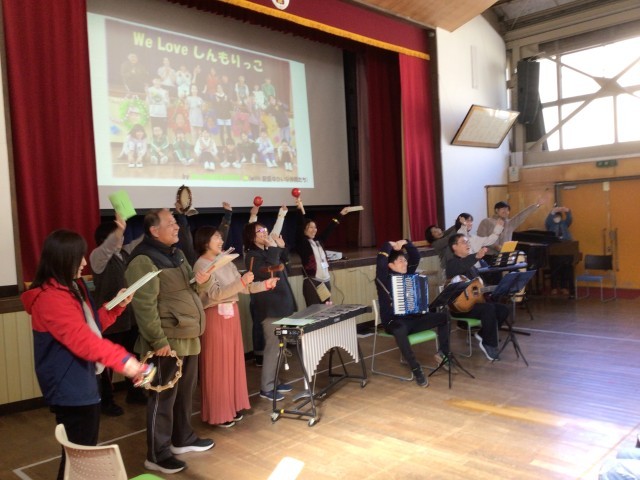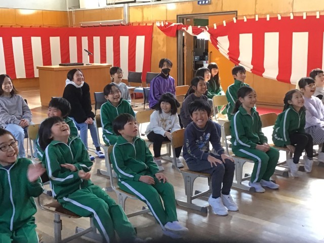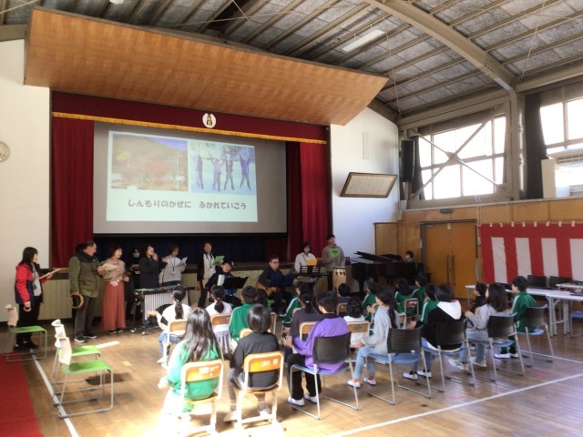 5.6年生が学習発表会で暗誦した「新盛の風にふかれて」。職員がこの詩にメロディーをつけ、曲が完成しました。「Mrs.golden apple」という本日1日限りのバンドを結成した本校職員が、子どもたちの前で曲を披露しました。曲ができるまでの様子を動画で見た時には、子どもたちの笑顔が絶えませんでした。今年一年、全力でがんばってきた新盛っ子へ、楽しい時間がプレゼントできていたらうれしいです。