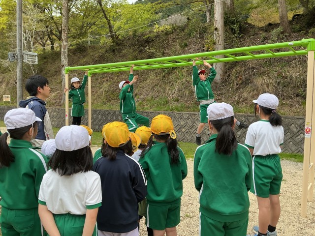 青空タイムには、1年生対象に遊具の使い方説明が行われました。上学年の子どもたちも、一緒に確認したりお手本を見せたり、楽しく遊びました。