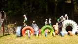 4月28日 1・2年体育 大きなタイヤの上を移動しています。忍者のような軽い身の...