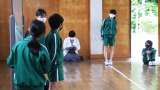 5月31日 3・4年体育 後ろ向きにジャンプで進みながら、脚を開いたり閉じたりし...