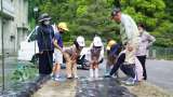 5月27日 1・2年生活科 畑の先生、松井さん夫妻にこつを教わりながら、トウモロ...