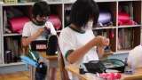 6月29日 5・6年家庭科 クマのぬいぐるみを作っています。型紙を使って布を切っ...