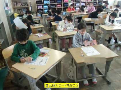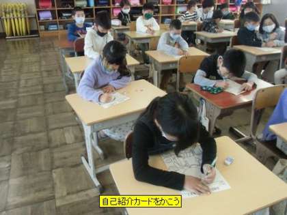 2年生の教室に行くと、自己紹介カードをかいていました。自分の好きなことや今年の目標を一生懸命に考えて、ていねいに書いていました。今年の意気込みを感じます。