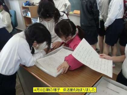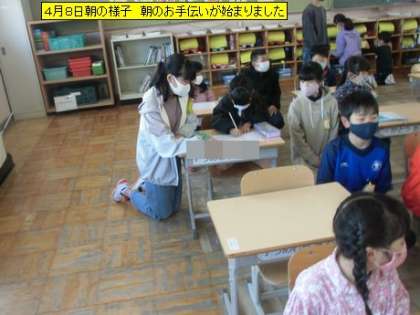 今日は、少し肌寒さを感じる朝ですが、子どもたちは元気に登校しています。1年生の教室に行くと、6年生のお兄さん・お姉さんがさっそくお手伝いに来てくれていました。それも自主的に。1年生と6年生がこれからたくさん関わることで、もっともっと仲良くなっていくと思います。とても微笑ましい光景でした。他のクラスを回ると、すでに係活動が始まっていました。学校が動き始めた感じがします。